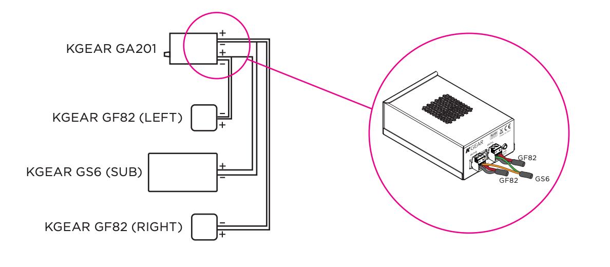 GA201は小売店、レストラン、ホテル、パブ、バー、住宅などの常設設置用に設計されており、KGEARのGF82スピーカーとGS6サブウーファーを駆動するのに最適で、シームレスなオーディオ体験を提供します。